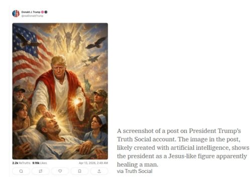 Now, can you even imagine if some rando blogger on the Internet, virtually unknown, had posted this AI-slop as a snarky way to slander Christians? Blasphemy! The POTUS does it and he earns thousands of likes. What’s up with that
