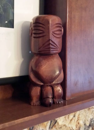 The powder blue mound oozing into the photo is a dog bed. One of several. There are days when it seems to me like we’re running a canine hostel here. The rug is from my parents. They bought it for me in Santa Fe almost fifteen years ago now. It’s gotten around — New Mexico –> Alaska –> Ohio –> Alaska. There’s a pad under it to make it cushy when you walk on it. Harry likes that. Our house is nicely decorated, thanks to Happy Wife. I’ve had almost no input in the decorating decisions around here. I’m not unhappy about that. If such things were left to me our house would be rather bland. The other day she came out of the crawl space with a souvenir I’d purchased about twenty years ago while on vacation in Roratonga (Cook Islands). I didn’t bring a lot of valuable stuff to our relationship; what there is of it is in the crawl space. So I like to joke anyway. In that way I think she felt sorry for me when she emerged from the hole in the floor, “Here,” she said, “maybe you’d like to put this somewhere?”