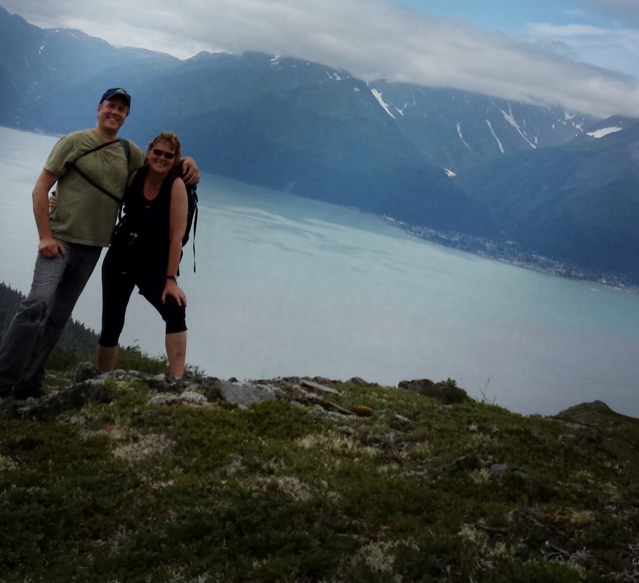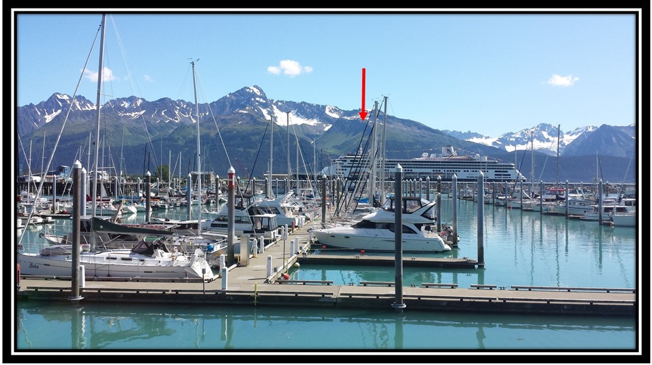 And from Seward later the same day, the arrow marks our turnaround. The summit of Mt. Alice looms to the left.