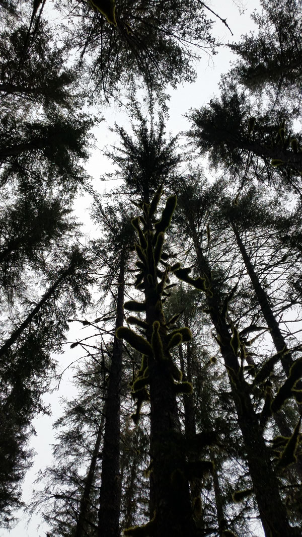 After the river, we usually walk through a woods to access the beach proper. To stop and look up is to see the tops of hundred year old trees (Western Hemlock?) with their curious little moss-laden appendages sticking out
