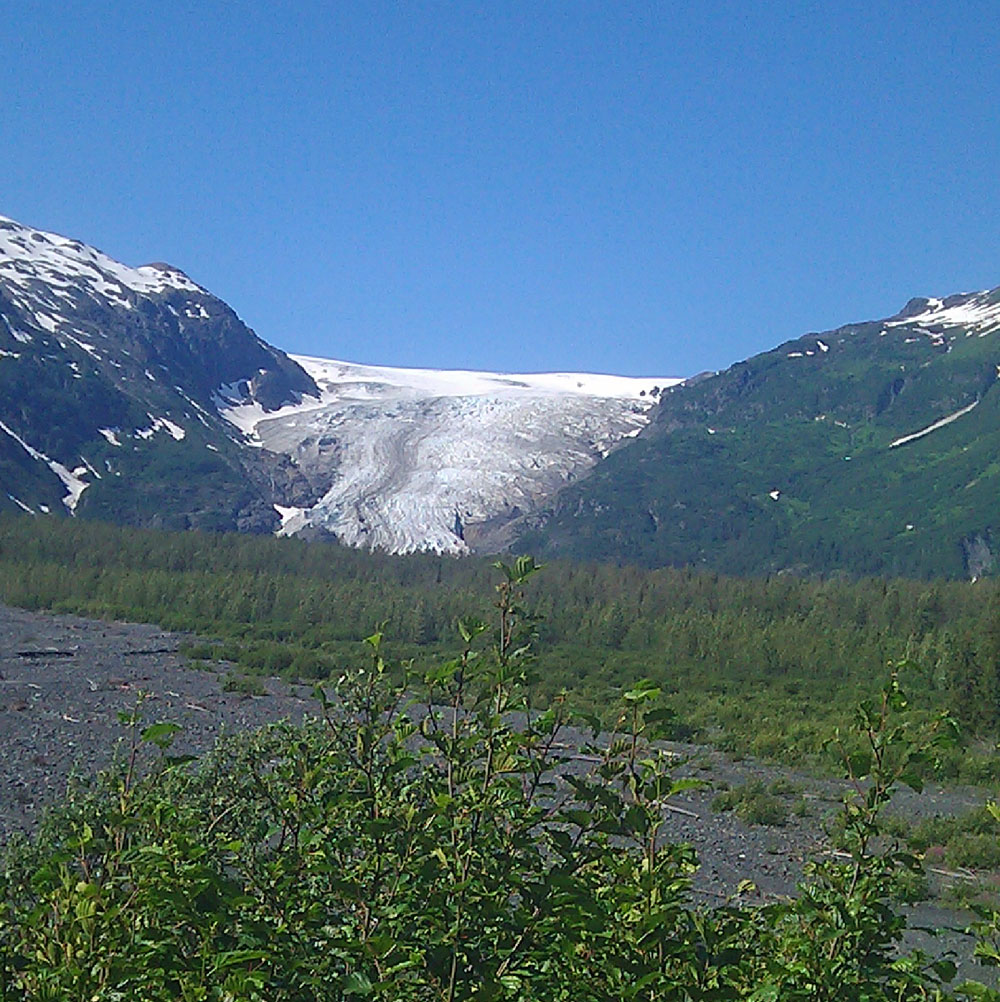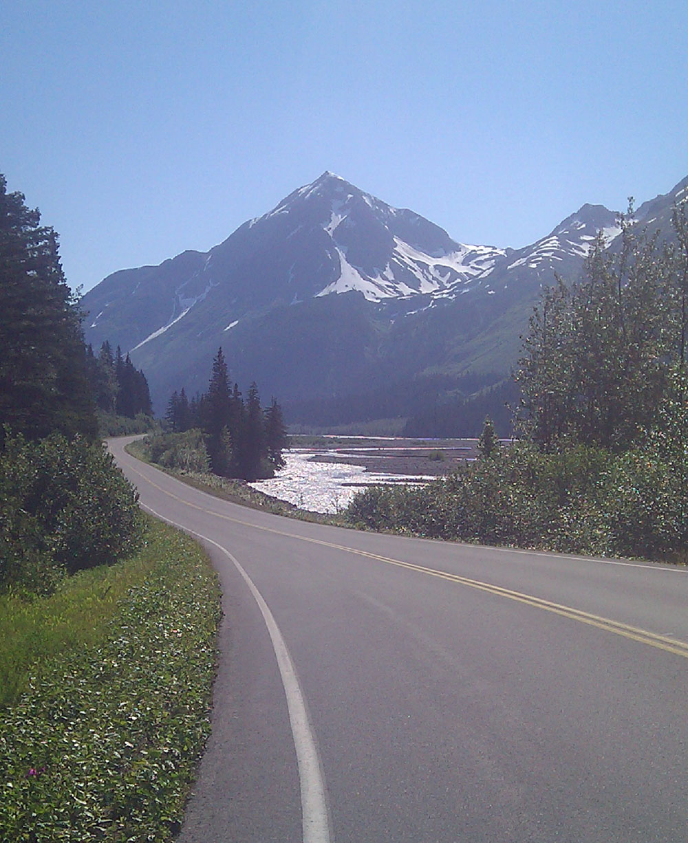 Back at the beach house I changed clothes and set out on Otis, headed for Exit glacier, pushed along by a nice tailwind, one I knew I’d be fighting on the return. But what a day! About halfway down the dead end road I got my first glimpse of all that remains of the aptly named Exit glacier.